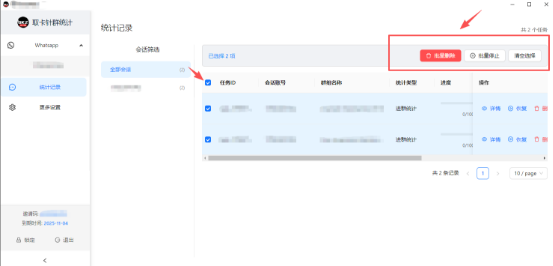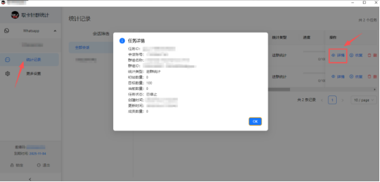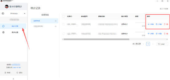 已经有过统计的账号会显示在统计记录里,并且设有可以手动删除统计记录、恢复统计和查看任务详情的功能。