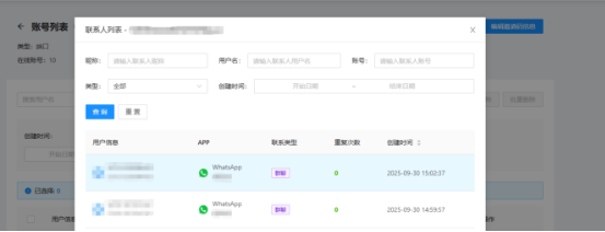 用于导出所选中账号(可指定时间范围内)的所有联系人明细报表。