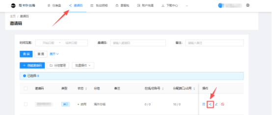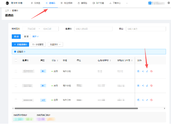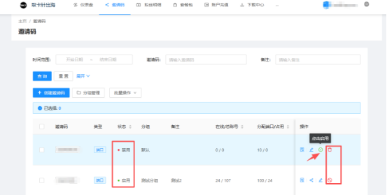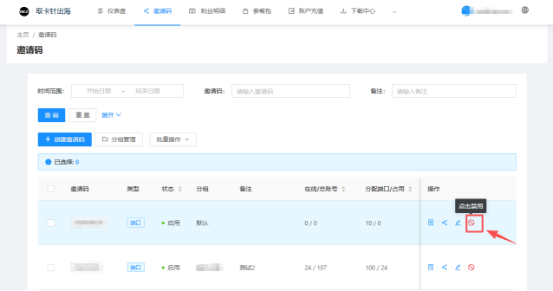 【禁用】邀请码之后变为【删除】,也可重新【启用】