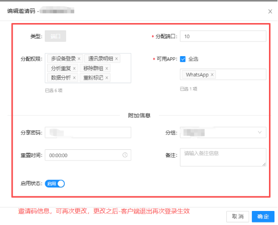 使用权限的变更与会话数的增加与减少都是在点击修改后立即反应到取卡针APP客户端;