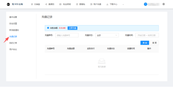 点击账户充值可进行账户金额【充值】