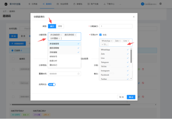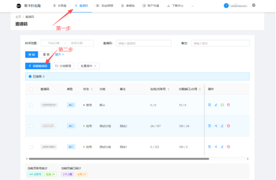 创建邀请码-【备注信息】-【分享密码】-【计数器置零时间】-和-【端口数量】-均可自定义信息和数量
